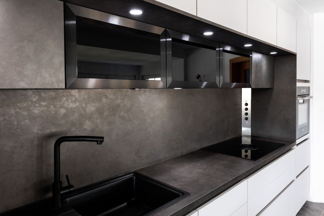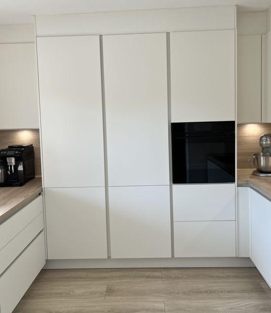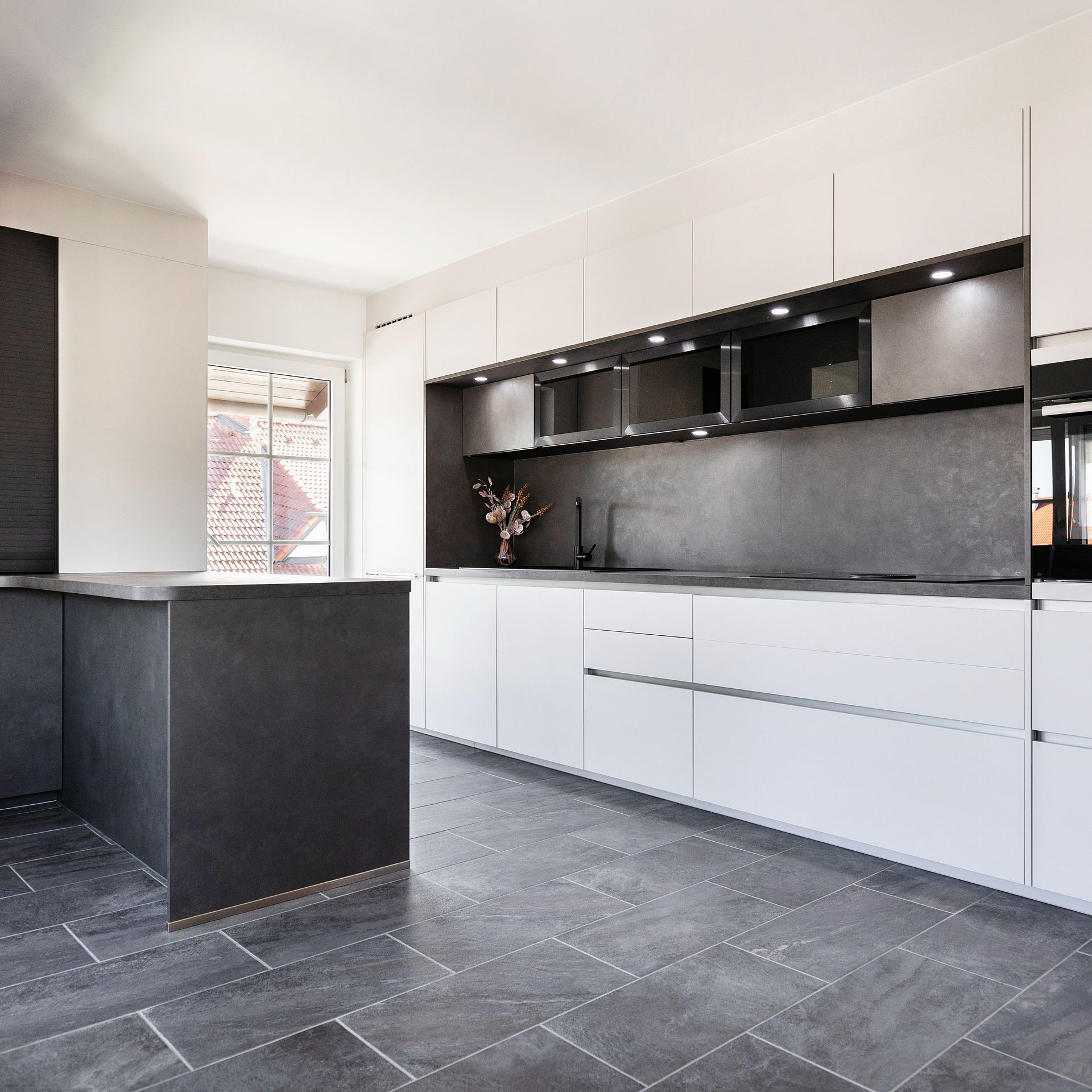 Diese Küche nutzt jeden Zentimeter: Sie erstreckt sich über ganze 10 Meter, ist grifflos und reicht bis zur Decke, was ihr ein super modernes Aussehen verleiht. Die Arbeitsplatten in Anthrazit aus hochwertigem Schichtstoff harmonieren perfekt mit den strahlend weißen Fronten, die beidseitig mit Melaminharz beschichtet sind – leicht zu reinigen und super praktisch. Ich habe auch an den Alltag gedacht: Alles ist praktisch und effizient geplant. Die Waschmaschine ist unsichtbar in die Küche integriert. Bei den Geräten setze ich auf Qualität - von Bosch über Siemens bis hin zu Miele – hier stimmt einfach alles. Abgerundet wird das Ganze durch eine elegante schwarze Granitspüle, die den modernen Look perfekt ergänzt.