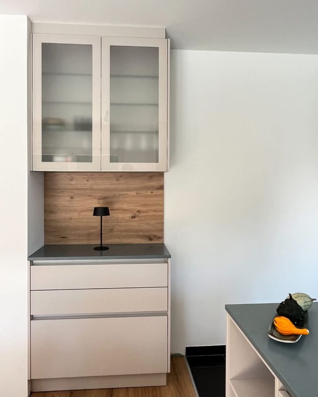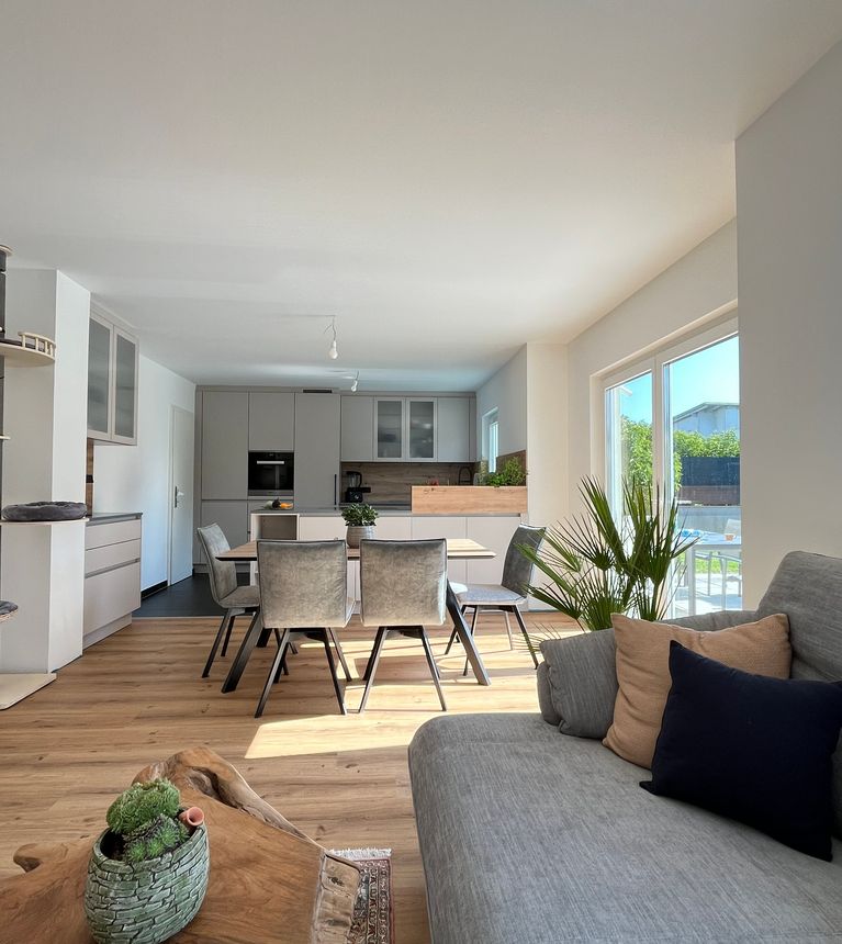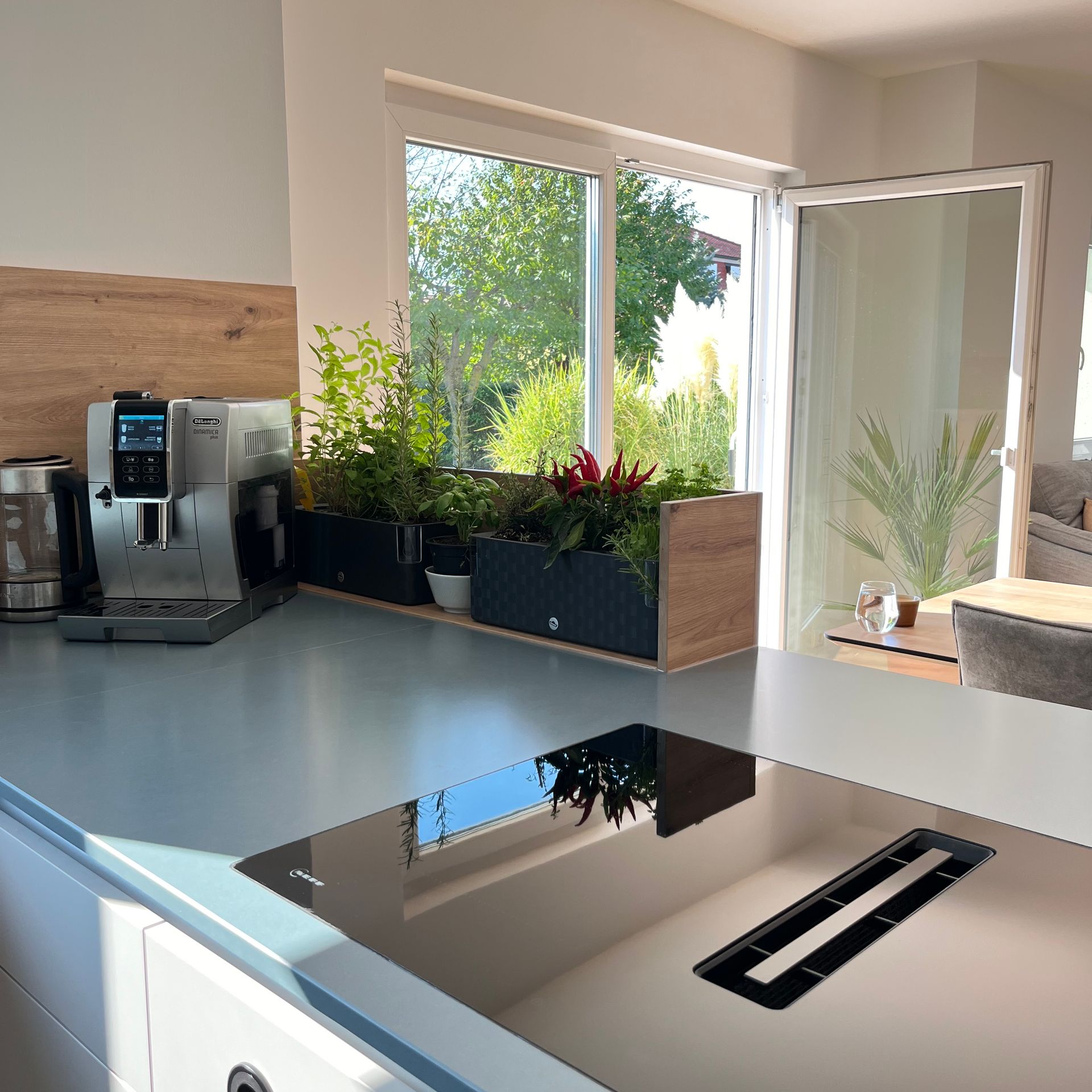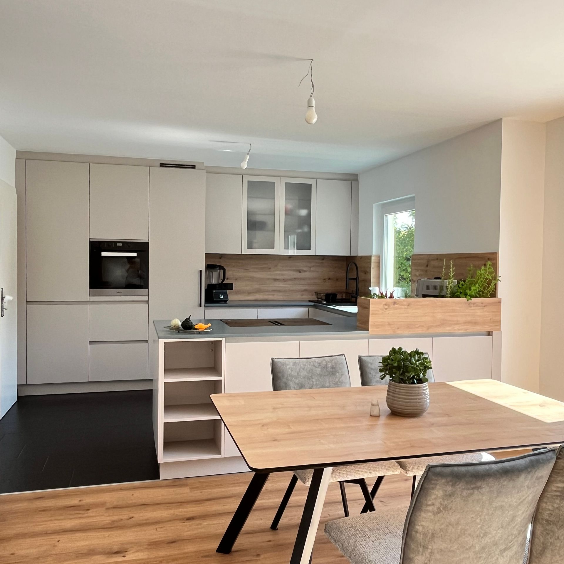 Dieses Wohnkonzept schafft ein stimmiges und einladendes Zuhause, das genau auf die Bedürfnisse moderner Paare zugeschnitten ist. In der Küche sorgen sandgraue, grifflose Fronten zusammen mit einer grauen Arbeitsplatte und einer schwarzen Spüle für ein schickes und pflegeleichtes Ambiente. Eine Rückwand aus warmem Eichendekor und ein praktischer Kräuterkasten verbinden Stil mit Funktionalität. Im Wohnraum ergänzen anthrazitfarbene Fliesen und ein warmer Holzboden die gemütliche Atmosphäre. Der große Eichentisch und die stilvollen Stühle im Essbereich sind ideal für gemeinsame Mahlzeiten, während die titanfarbene Couch mit ihrer feinen Struktur und den verstellbaren Rückenteilen zum Entspannen einlädt. Ein TV-Schrank, der zu den Küchenfronten passt, rundet das Gesamtbild ab und macht das Wohnen hier besonders angenehm.
