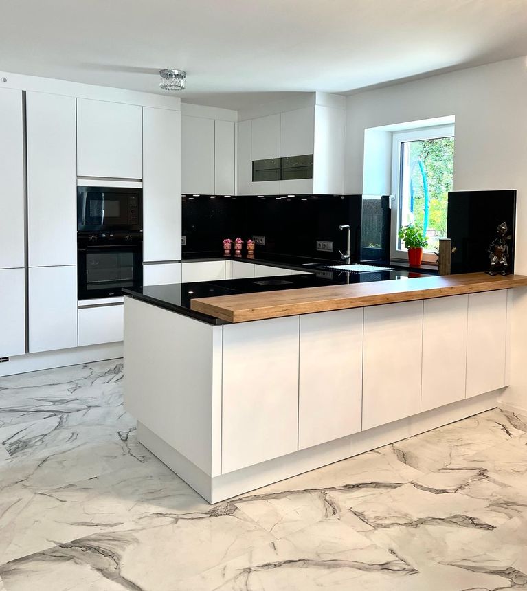 Weiß | Schwarze Stein-Arbeitsplatte | Holzakzent