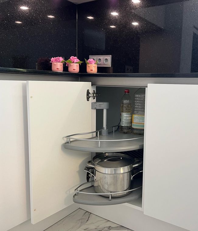 Diese Küche kombiniert Funktionalität mit Stil und bietet alles, was eine große Familie braucht. Die Fronten sind durchgehend in strahlendem Weiß gehalten, was den Raum hell und einladend macht. Die Arbeitsplatte aus schwarzem Stein mit dezentem Glitzer ist nicht nur ein Blickfang, sondern auch besonders pflegeleicht. Das grifflose Design sorgt für eine saubere Linienführung und einen reibungslosen Arbeitsablauf. Es gibt reichlich Stauraum, sodass alles von Küchenutensilien bis zu den Lieblingssnacks der Kinder leicht zu verstauen ist. Die Beleuchtung in den Hängeschränken und der Nische bringt jeden Winkel zum Strahlen, während die Hängeschränke mit schwarzen Glaseinsätzen einen zusätzlichen eleganten Akzent setzen. Ein schöner Holzakzent mit integrierter Bar macht diese Küche nicht nur praktisch für das tägliche Kochen, sondern auch zu einem zentralen Treffpunkt für Familie und Freunde.
