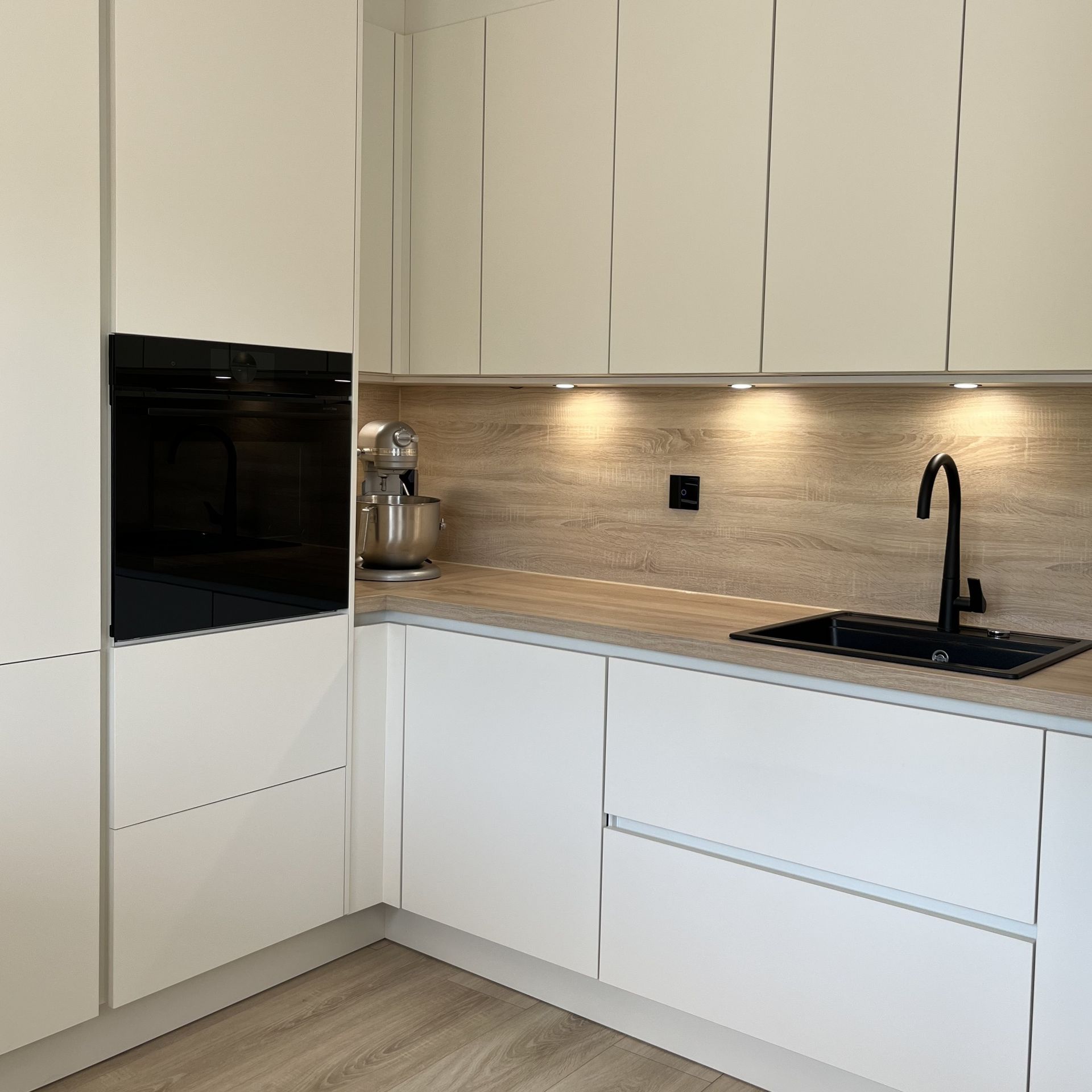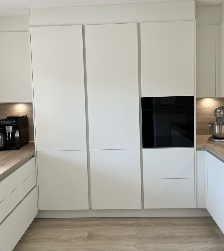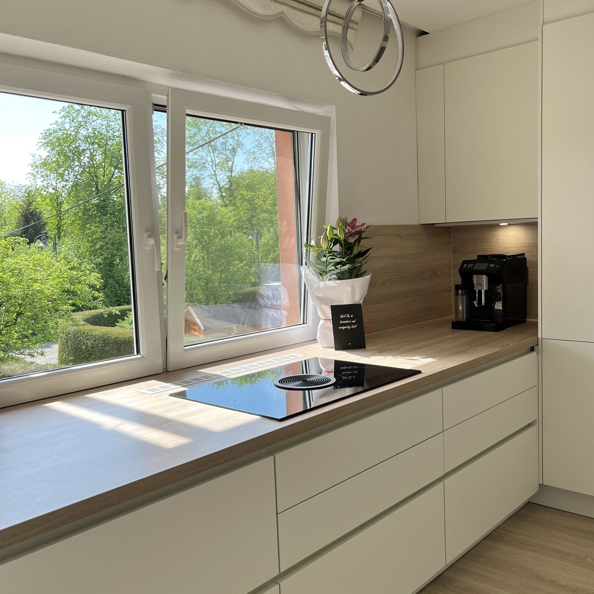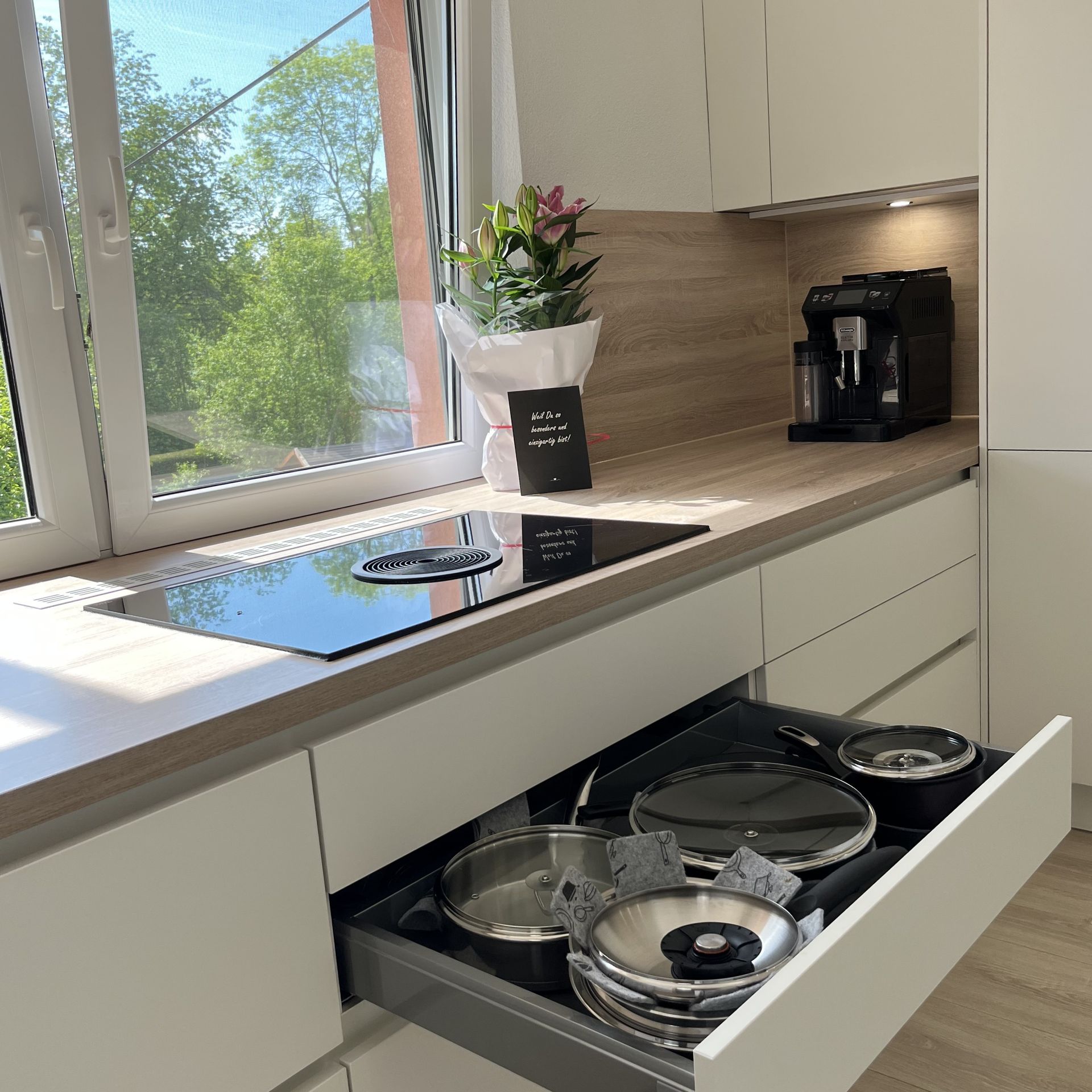 Für unsere Kunden haben wir eine Küche gestaltet, die zeitloses Design und moderne Funktionalität perfekt vereint. Die elegante Kombination aus hellem Weiß und warmem Eichenholz harmoniert wunderbar und schafft ein stimmiges Gesamtbild. Die Fronten sind mit versteckten Griffmulden versehen, was der Küche einen sauberen und modernen Look verleiht. Durchdachte Nischen bieten ideale Ablageflächen für Küchengeräte und die beliebte Kaffeemaschine – alles ist ordentlich und leicht zugänglich. Ein vollintegrierter Geschirrspüler und das Bora Induktions-Kochfeld mit integriertem Abzug erleichtern die Küchenarbeit erheblich. Die schwarze Granitspüle mit passender Armatur ist nicht nur funktional, sondern auch ein echter Blickfang. Der durchdachte Stauraum sorgt dafür, dass alles Notwendige griffbereit ist.