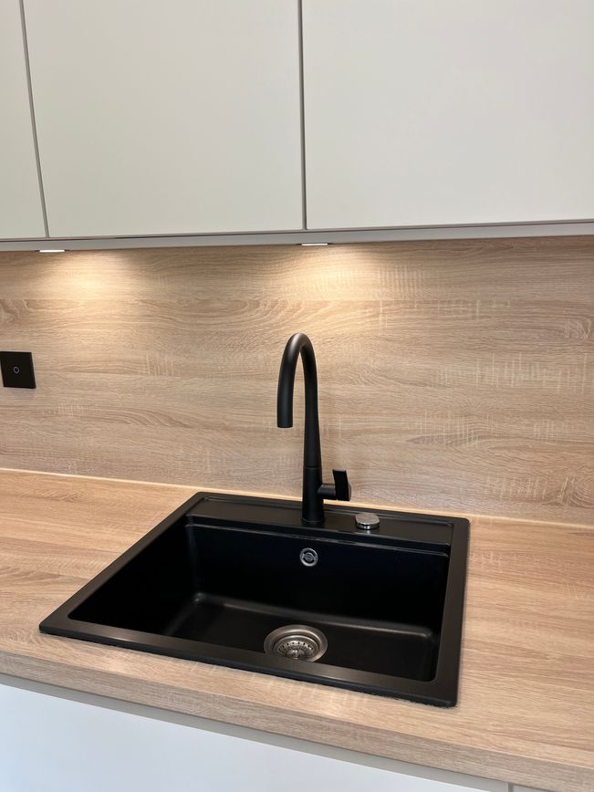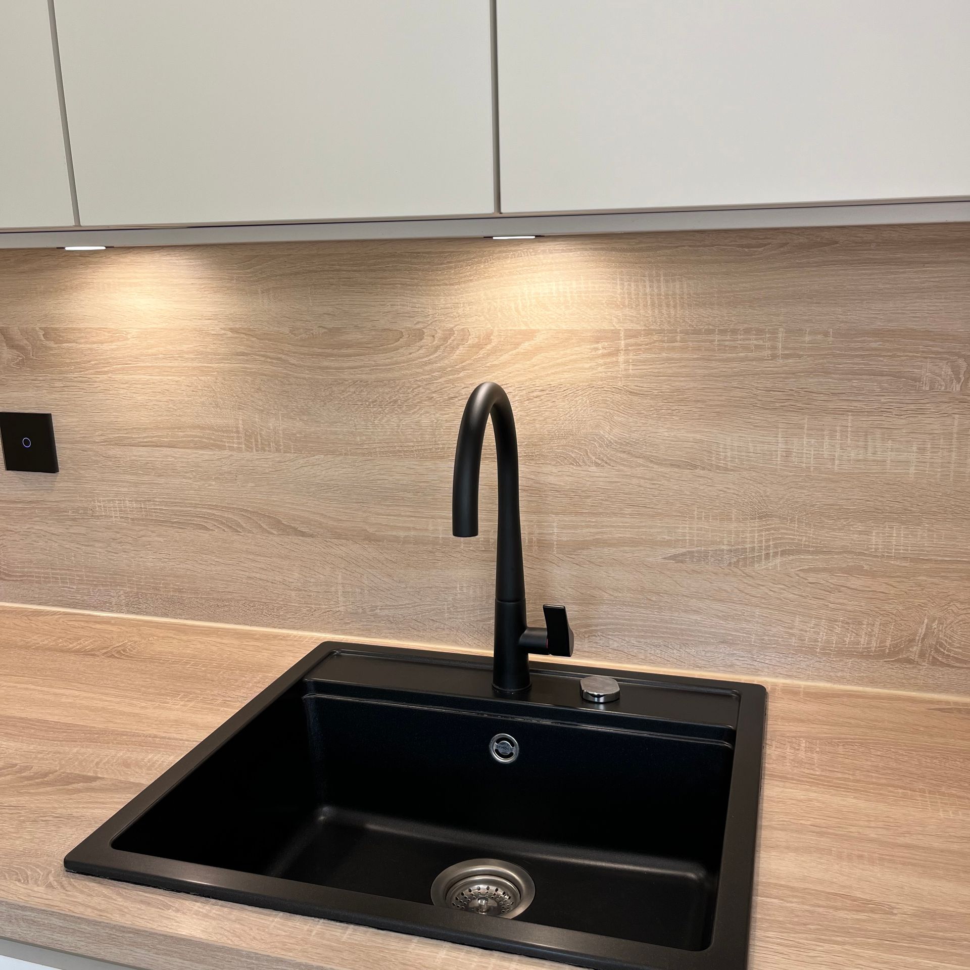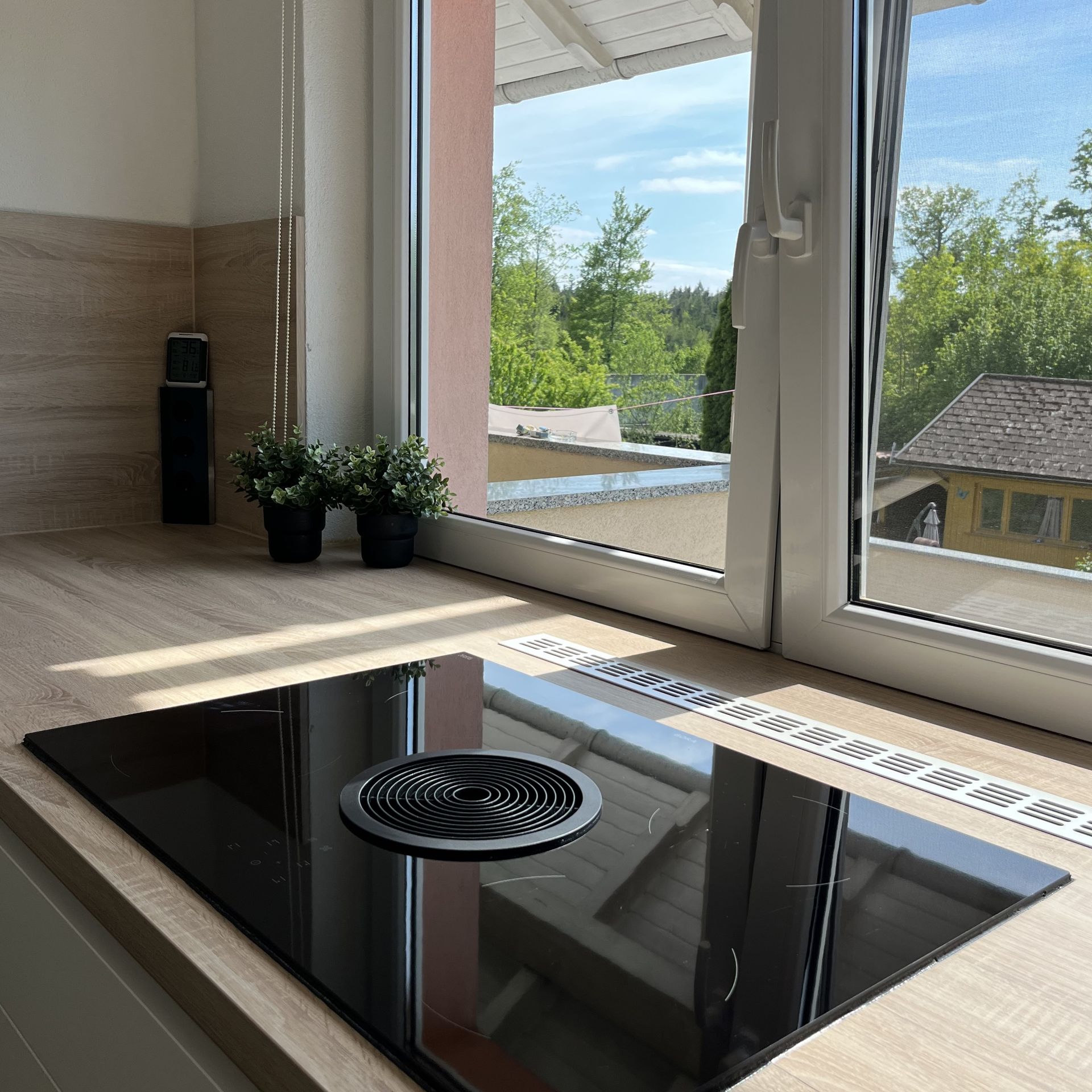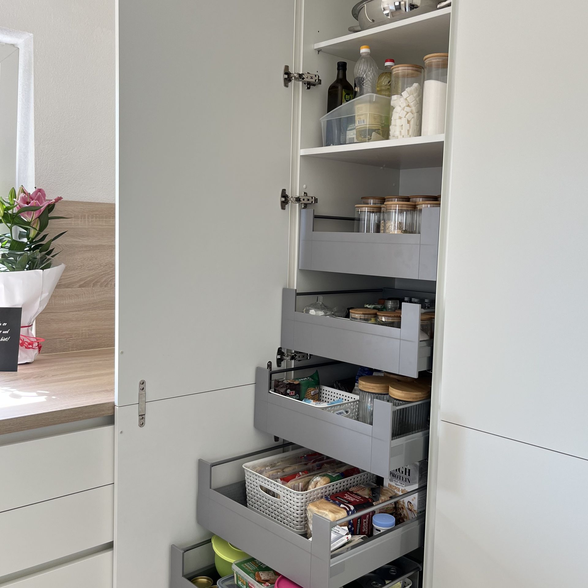 Für unsere Kunden haben wir eine Küche gestaltet, die zeitloses Design und moderne Funktionalität perfekt vereint. Die elegante Kombination aus hellem Weiß und warmem Eichenholz harmoniert wunderbar und schafft ein stimmiges Gesamtbild. Die Fronten sind mit versteckten Griffmulden versehen, was der Küche einen sauberen und modernen Look verleiht. Durchdachte Nischen bieten ideale Ablageflächen für Küchengeräte und die beliebte Kaffeemaschine – alles ist ordentlich und leicht zugänglich. Ein vollintegrierter Geschirrspüler und das Bora Induktions-Kochfeld mit integriertem Abzug erleichtern die Küchenarbeit erheblich. Die schwarze Granitspüle mit passender Armatur ist nicht nur funktional, sondern auch ein echter Blickfang. Der durchdachte Stauraum sorgt dafür, dass alles Notwendige griffbereit ist.